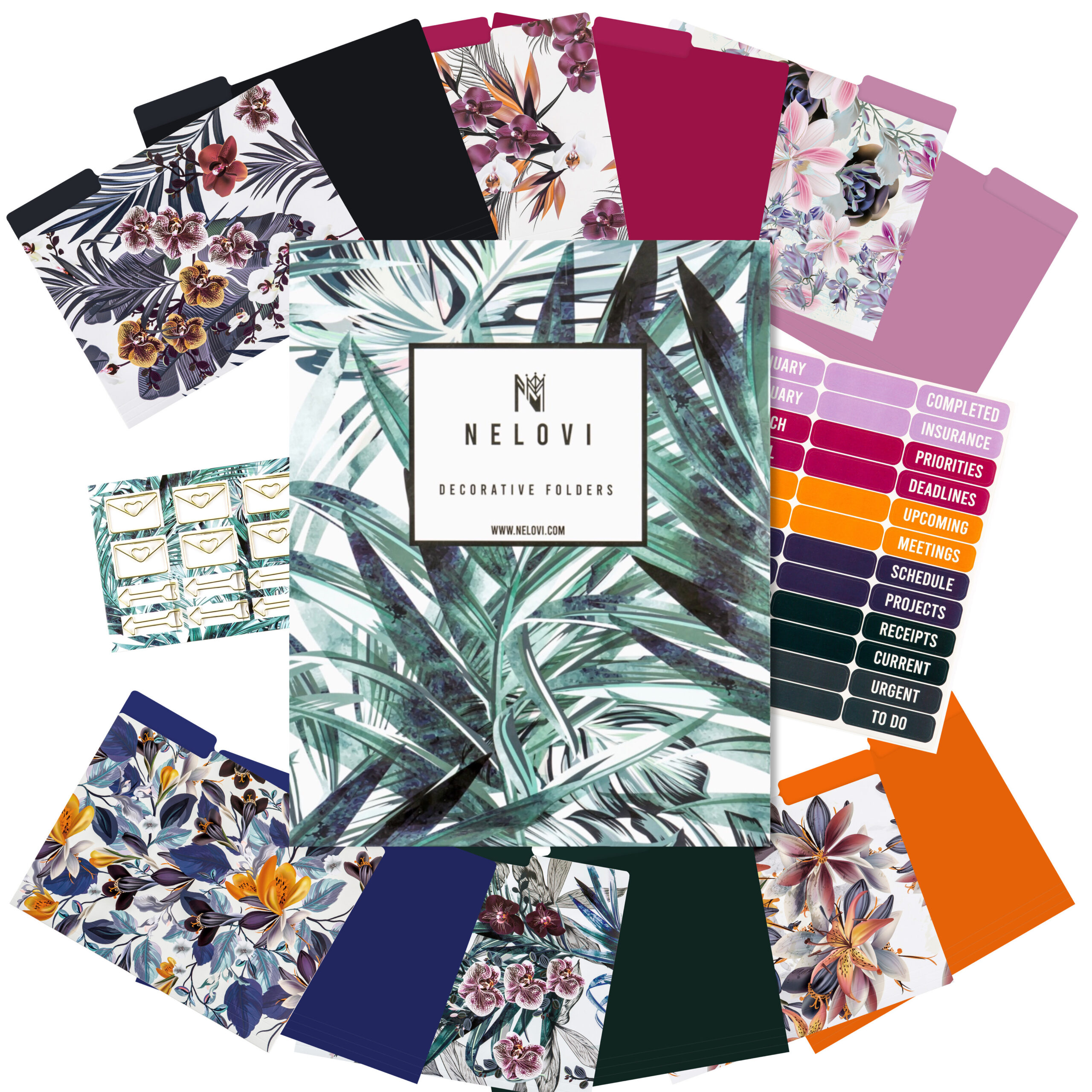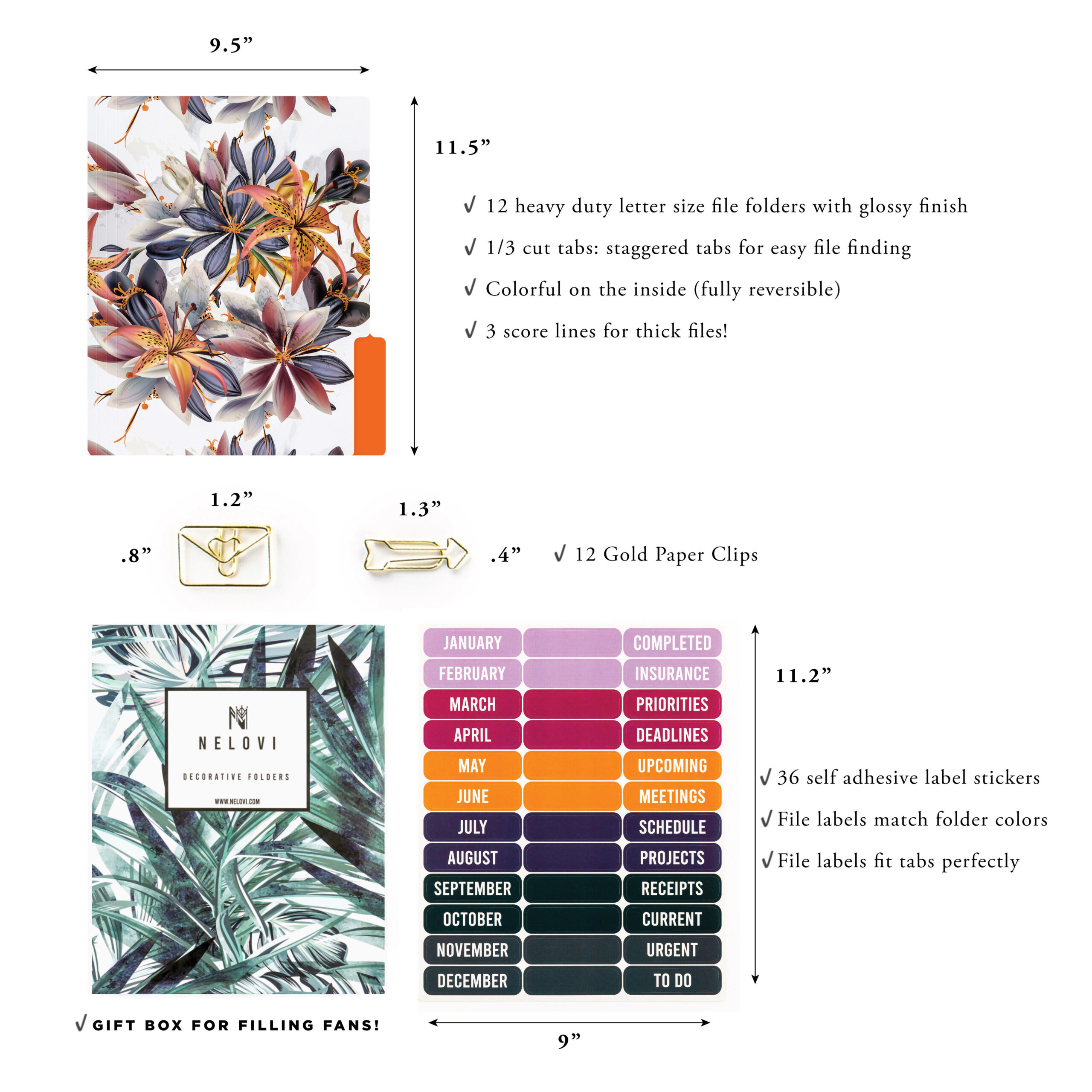 • đź—‚ ATTENTION TO DETAIL: Each 11.5” x 9.5” files folder is 1” wider than regular colored file folders letter size, for fatter files! We even added 3 score lines to accommodate them! You get 12 folders (6 floral, 6 colorful) and the file tabs are spaced out for easy identification (4 on LHS, 4 center, and 4 on RHS).